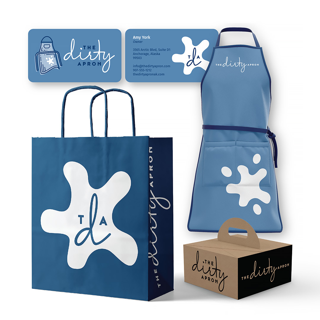 The Dirty Apron asked Mad Dog Graphx to create a logo that embodied the fresh, funky, and family-friendly atmosphere of their new gourmet kitchenware and cooking class boutique in midtown Anchorage, Alaska. Mad Dog paired a lively apron mascot with a sophisticated custom wordmark to balance the high-end feel of the store with the approachable, fun, and community-focused attitude of the owners and staff. The Dirty Apron offers cooking classes for both adults and kids, taught by a rotating lineup of your favorite local chefs. Upscale kitchen products and countertop appliances fill the shop, begging to be explored. The space is also available for private catered events.